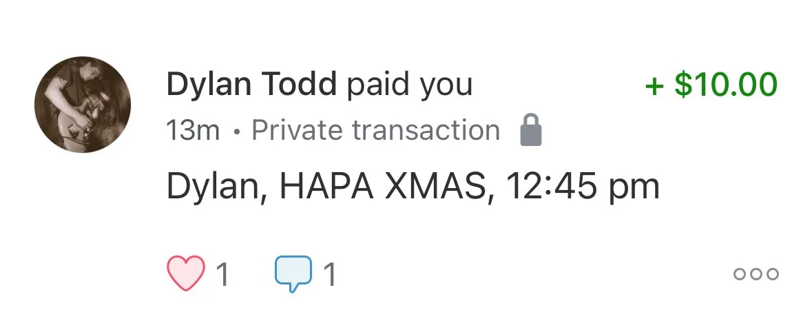 Provide your name, “HAPA XMAS”, and time in the notes of the transaction