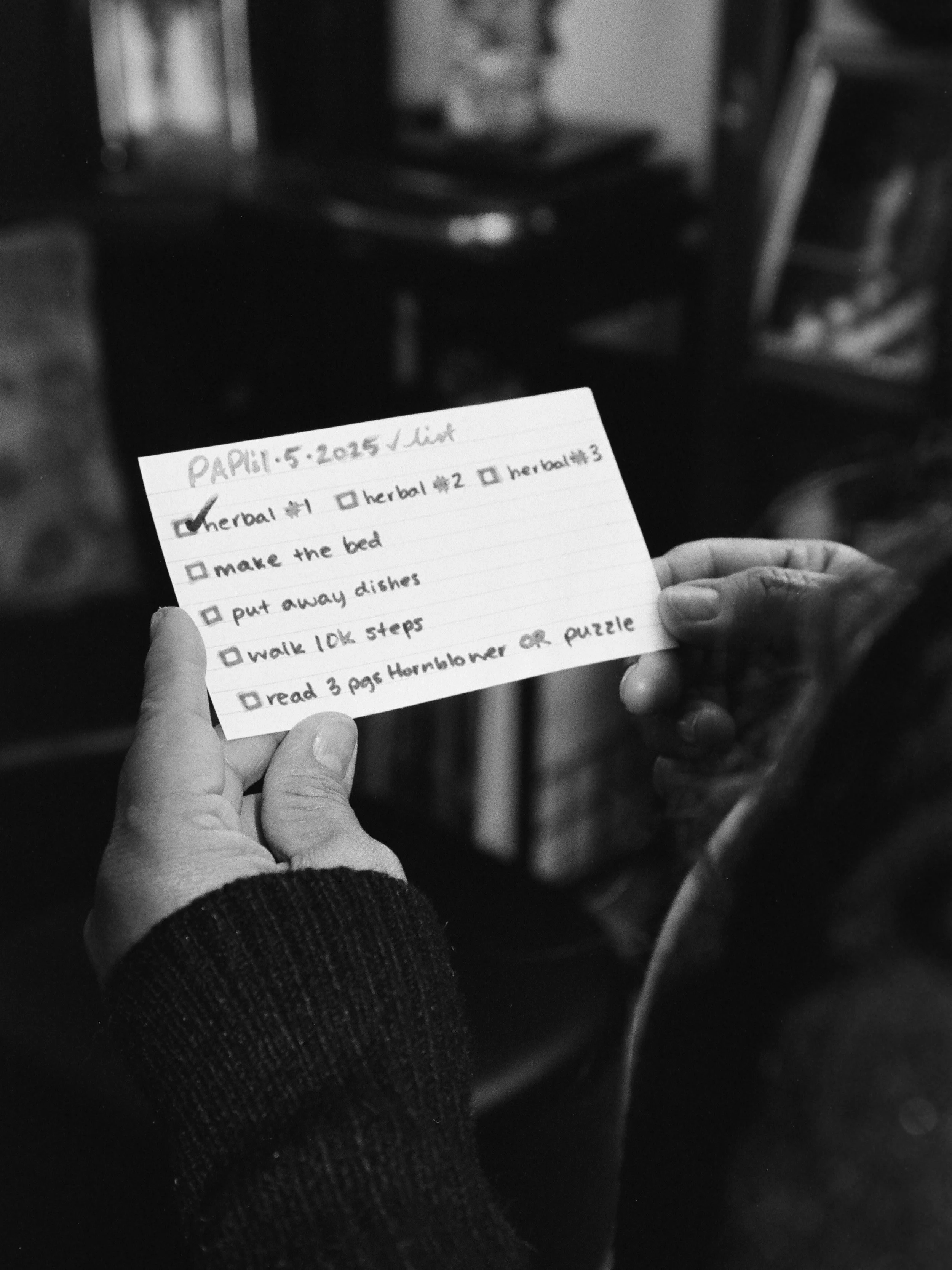 Lenny, 61 years old, was diagnosed with early onset Alzheimer’s in 2024. His family writes daily to-do lists to prompt him.
